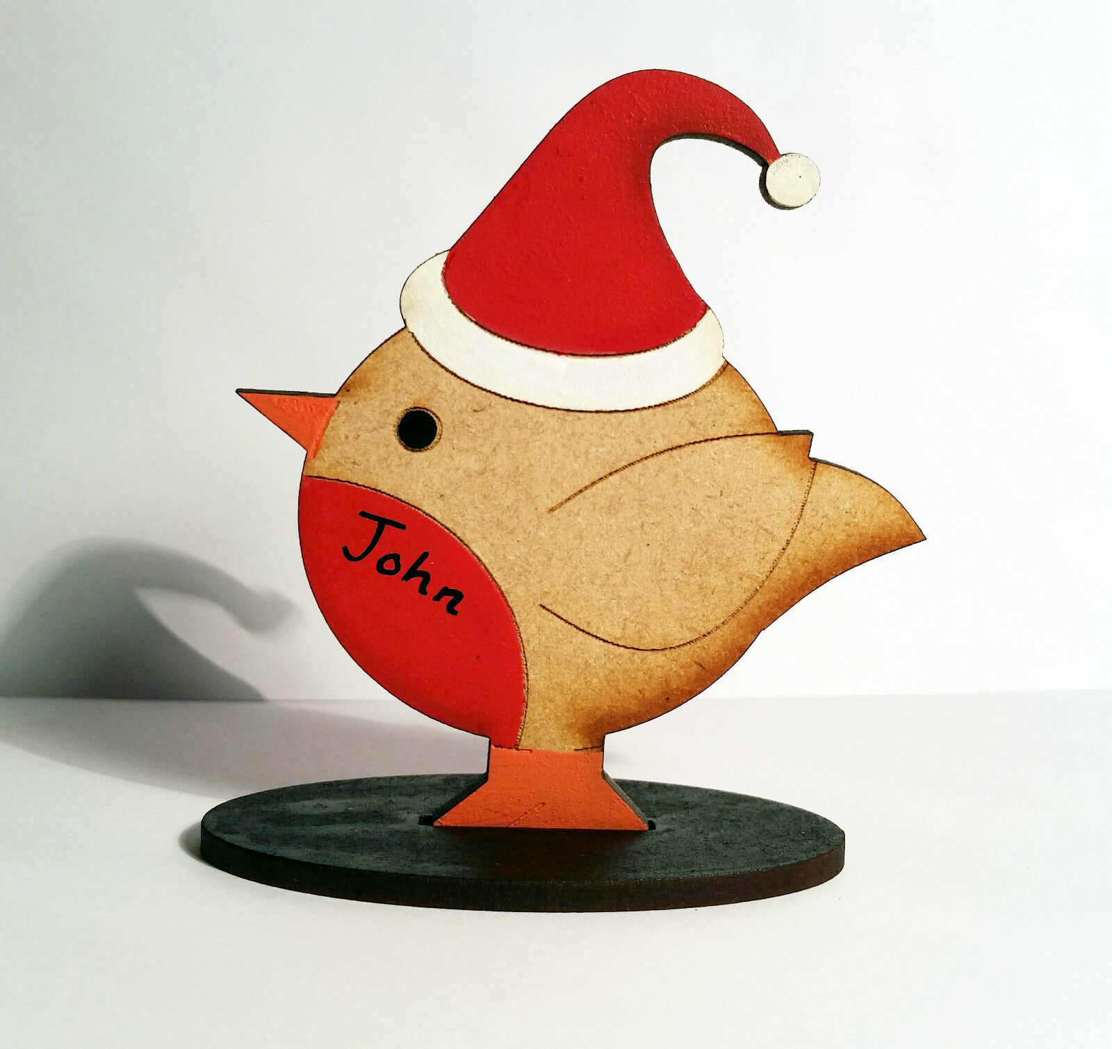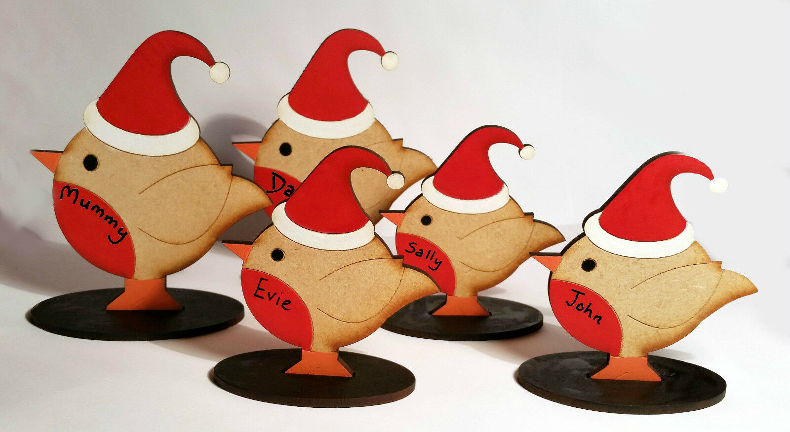 There are 2 sizes available. The adult robins are approximately 10cm tall and the child robins are 8cm tall. They are laser Cut from 3mm MDF